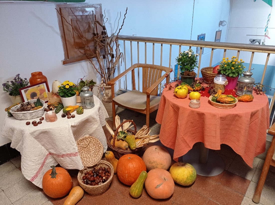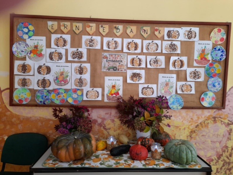 Terményasztalt, illetve terménysarkot alakítottunk ki, melyre őszi termények, illetve a gyerekek által készített terménydíszek kerültek kiállításra. Osztálytermet, faliújságot dekoráltunk.