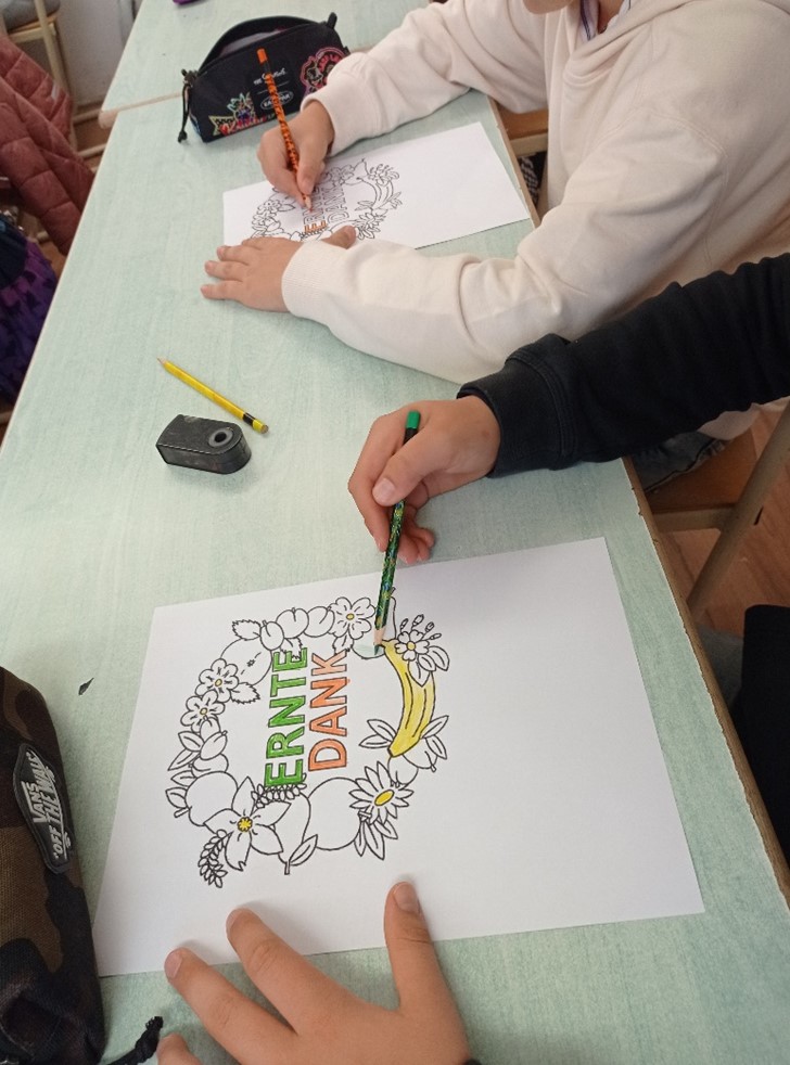Német nemzetiségi nyelvórákon, illetve német hon- és népismeret órán megbeszéltük az aratás jelenőségét, verseket, mondókákat, dalokat tanultunk. Rengeteget kézműveskedtünk, készítettünk könyvjelzőt, őszi terménymandalát "Apfeljahr-Buch"-ot, őszi manót, terményekkel teli kosárkát, terményképet is lencse és sárgaborsó felhasználásával.. Tanulóink minden évben örömmel vesznek rész a különböző foglalkozásokon. A munka végeztével szívesen fogyasztották a lédús gyümölcsöket is.